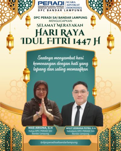 Dalam suasana penuh kemenangan tersebut, Ketua DPC PERADI SAI (Suara Advokat Indonesia) Lampung, Mas Ariona S.H., C.T.A yang akrab disapa Kanjeng Ayoe Arizona, bersama Sekretaris Willy Lasmana Putra, S.H., menyampaikan ucapan selamat Hari Raya Idul Fitri 1447 Hijriah kepada seluruh masyarakat, khususnya umat Muslim di Provinsi Lampung.