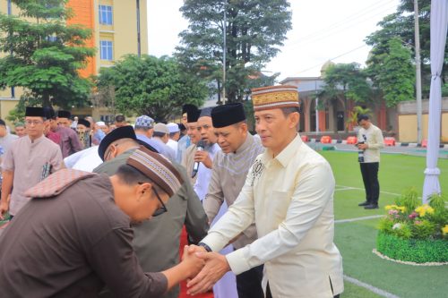Suasana penuh keakraban dan kekeluargaan tampak mewarnai kegiatan tersebut saat pimpinan, personel, Bhayangkari, dan masyarakat saling bersalaman serta bermaafan dalam nuansa Hari Raya Idul Fitri.